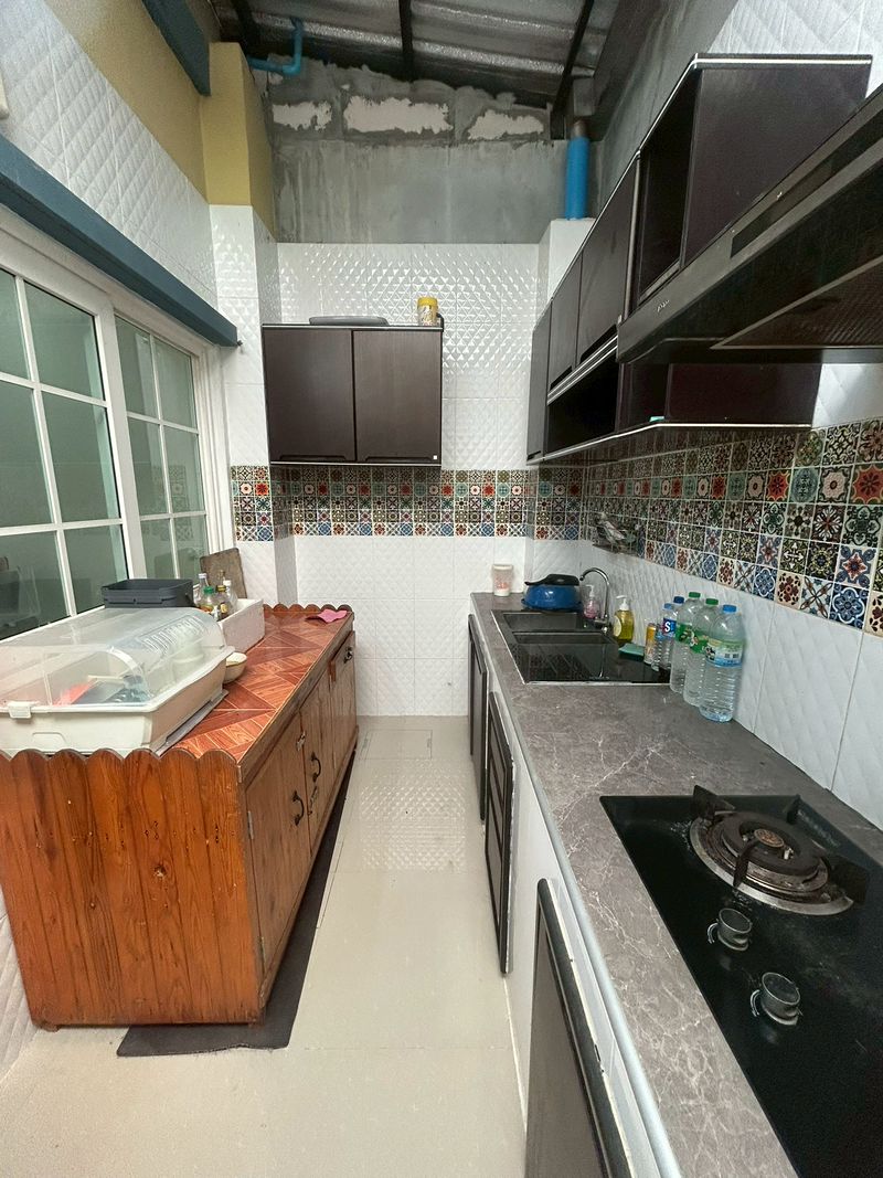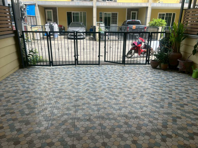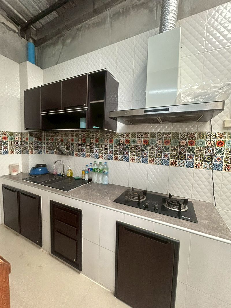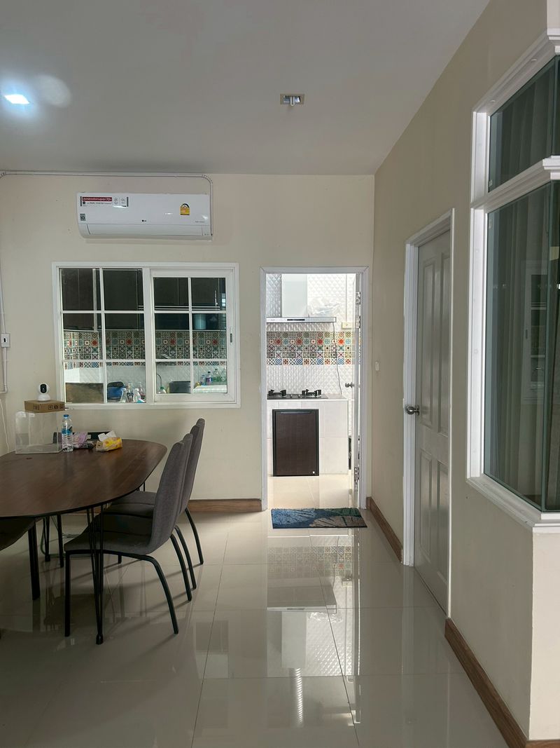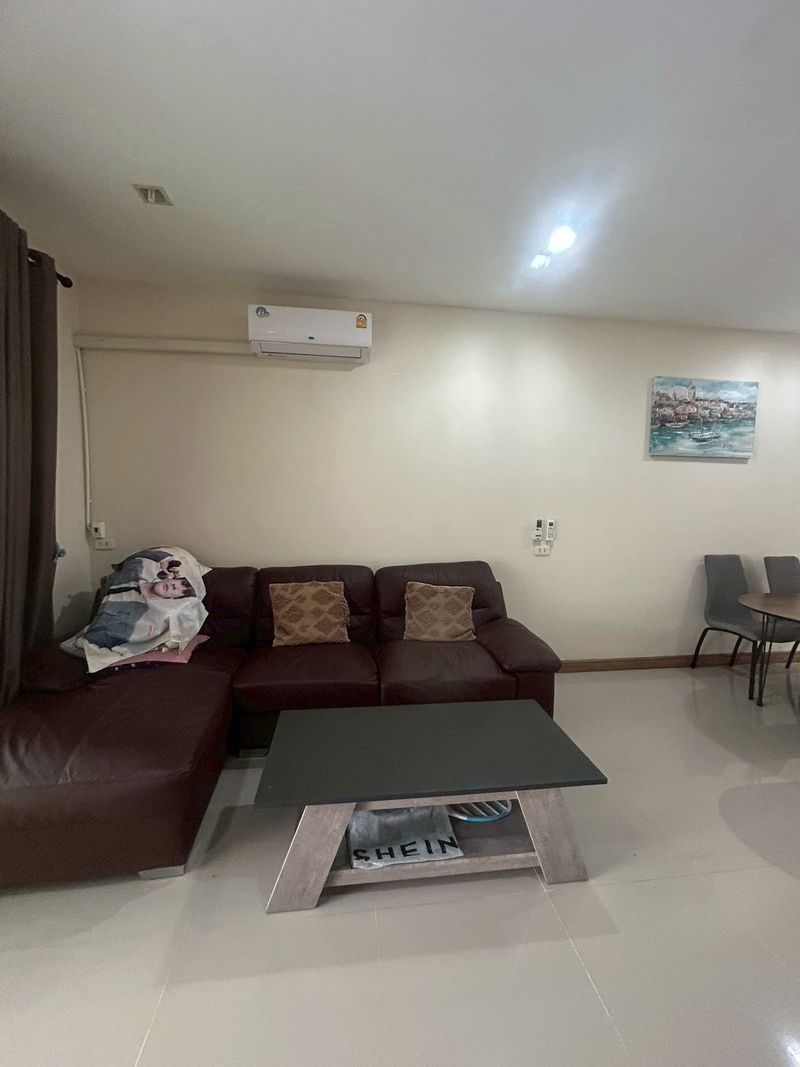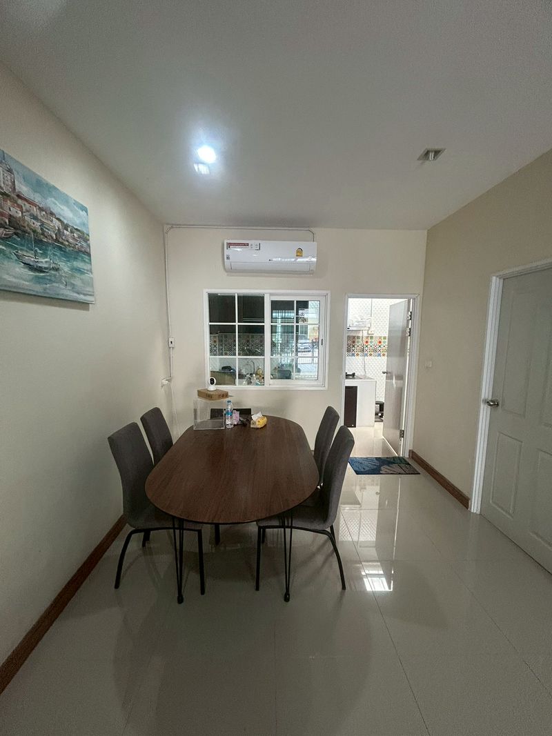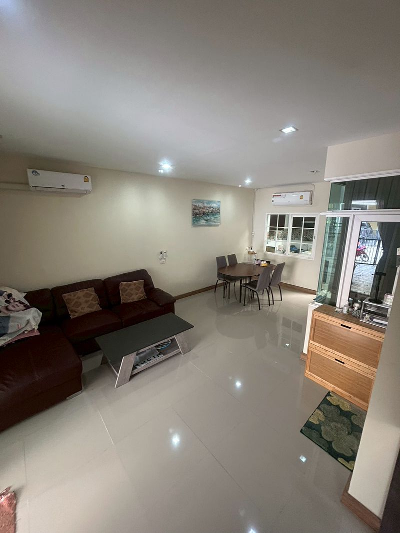 dining table, sofa, TV, refrigerator, marble bench in front)